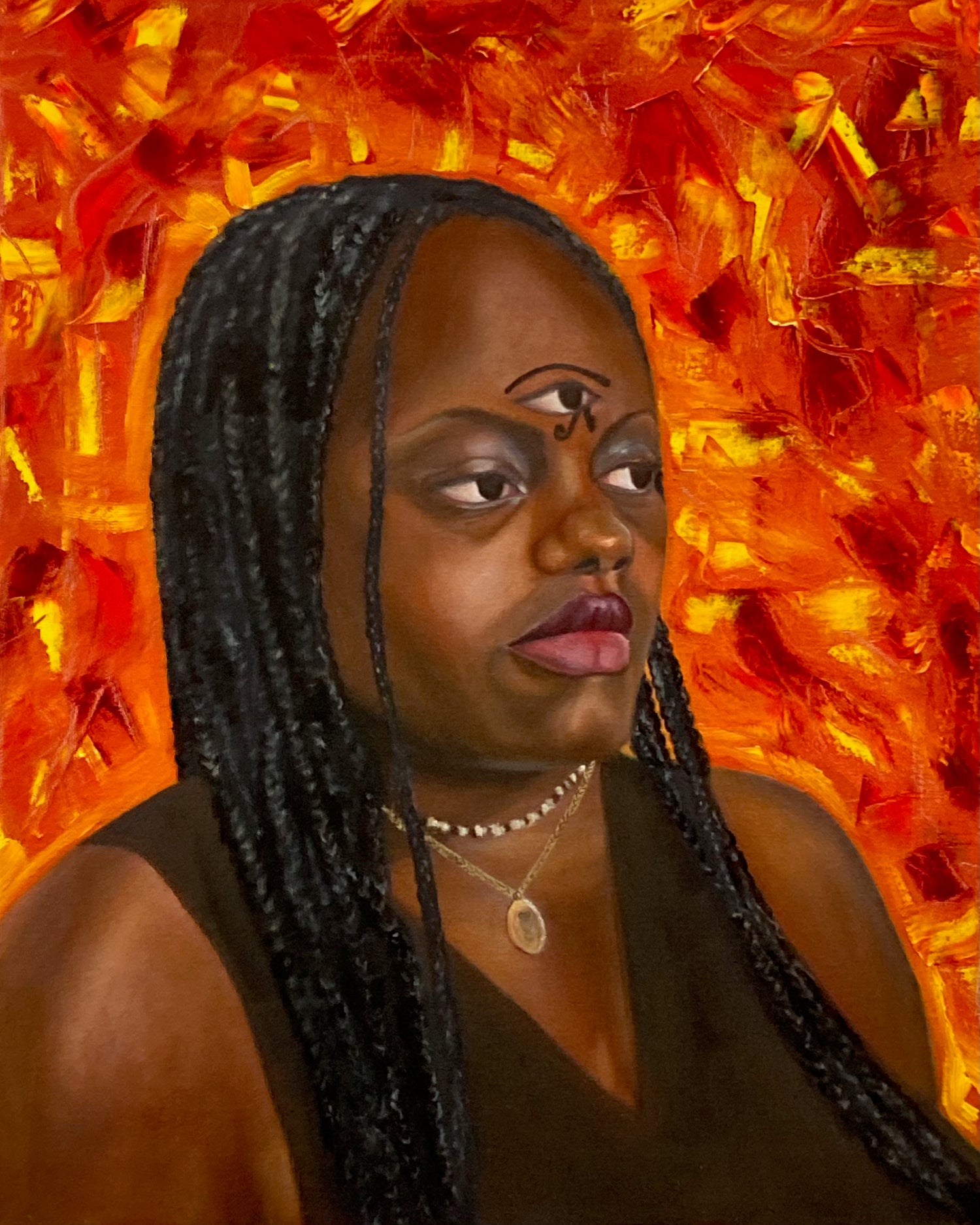 MoonChild’s first portrait painting in oil, toying with the energy of colors and its parallels with hidden identity.