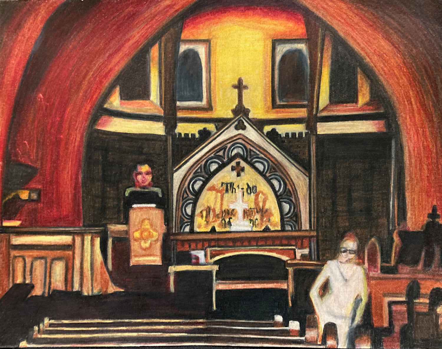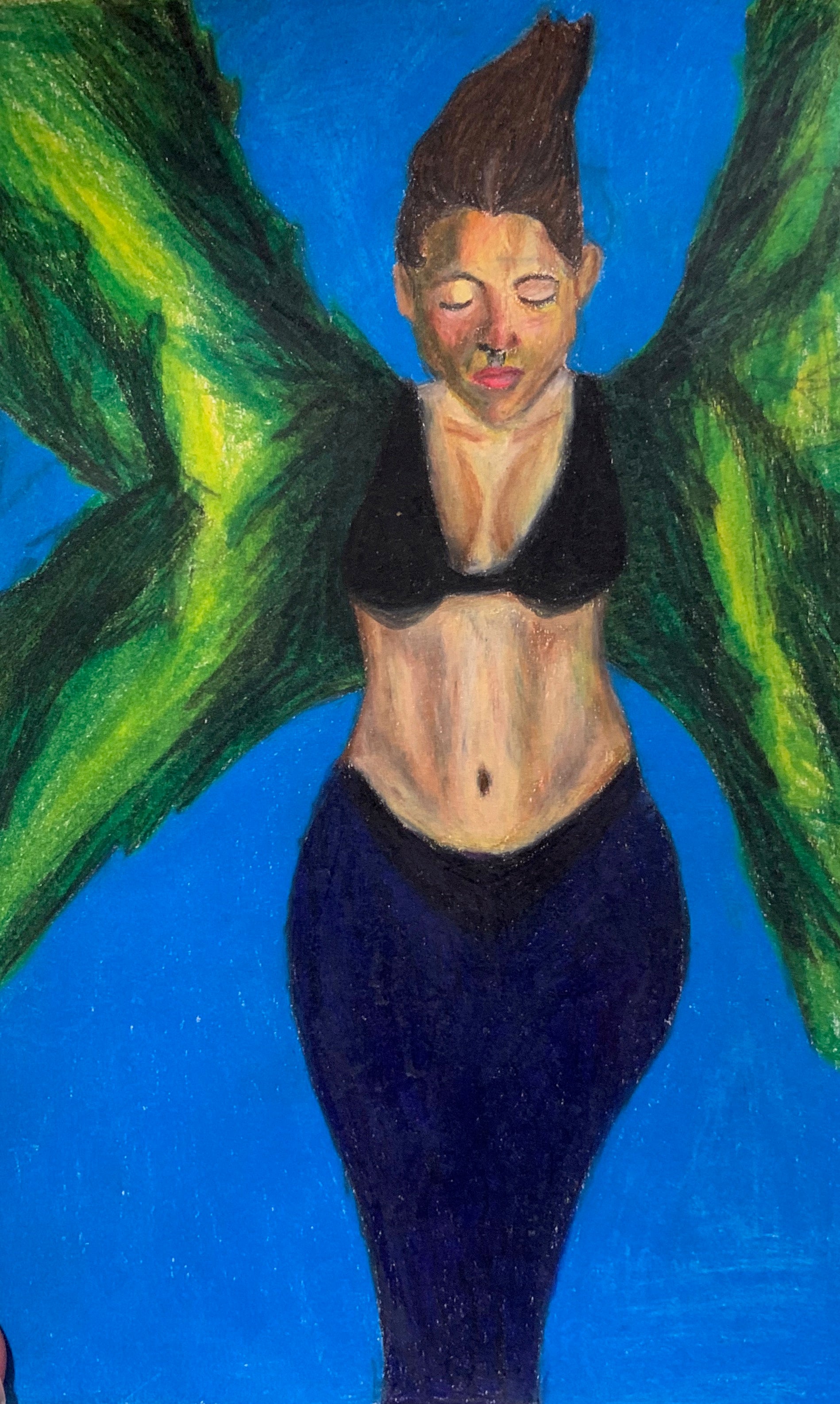 MoonChild invites you to explore the intricate dance between dysphoria of the body and of identity. In this painting, this juxtaposition is compared to the zeal of western ideals.