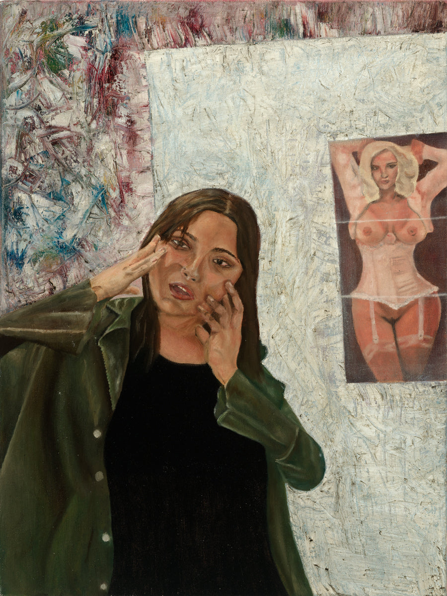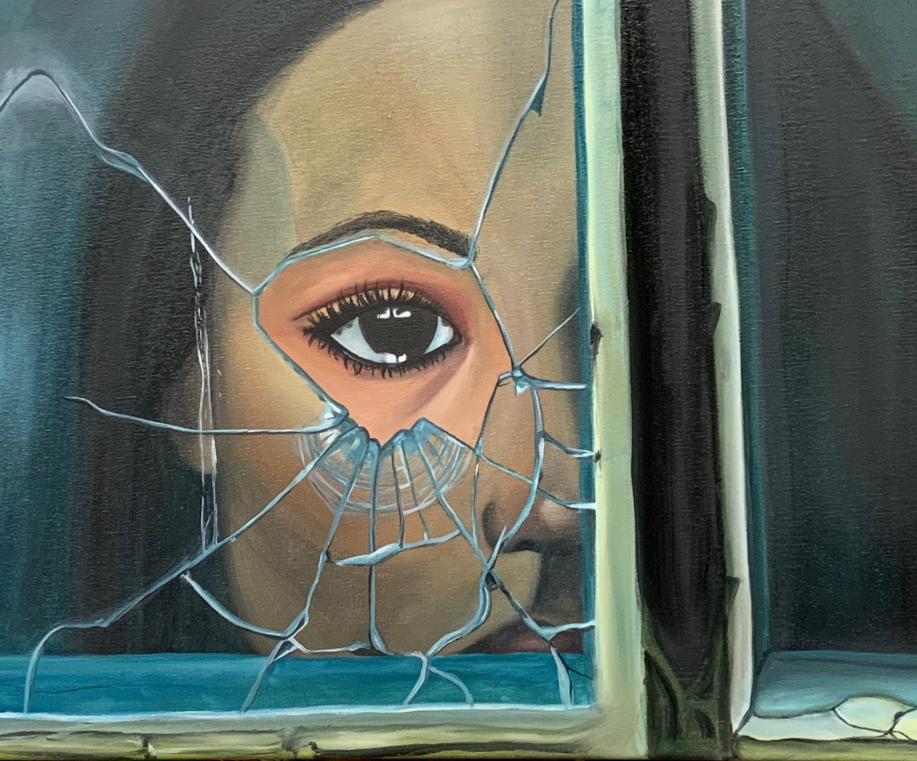An oil painting depicting a woman searching for solace behind a fractured glass.