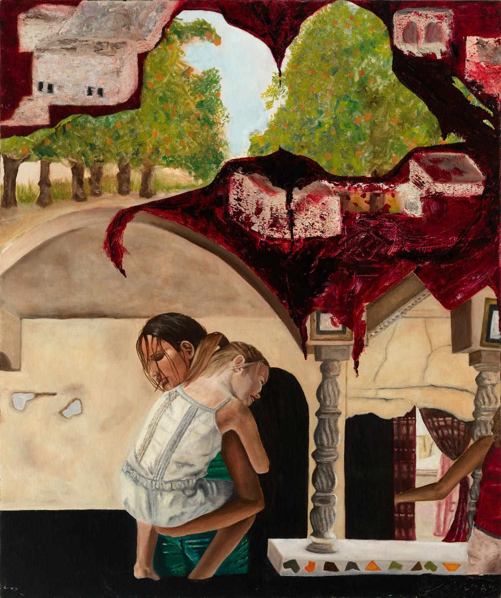 A stirring oil painting on canvas depicting a multi-generational Palestinian psyche. What began as children and families escaping the ravages of war quickly turned into the complete loss of home. The orange and olive groves that once were communities of nourishment quickly became replaced with daunting blood soaked villages and a perceived forgotten people. MoonChild works to unveil the reality of a surviving culture still searching for hope and renewal in a tapestry forcably woven.